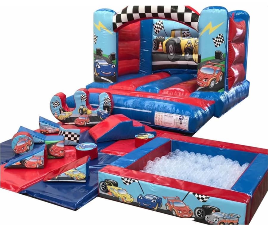 Cars Themed Bouncy Castle, 10 Piece Soft Play Set, Soft Play Steps & Slide, Soft Play Double Rocker and 300 Balls.