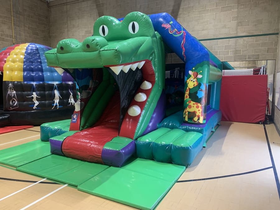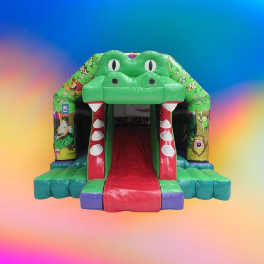 Do you and your family love a party? Do you like to dance? Then why not hire this fantastic Disco Crock front slide? This inflatable combines the energy of a disco with the fun of a slide. Perfect to make any celebration extra magical. Inside you will find a sound and light system to entertain you! With this Disco Crock you can bounce, dance, and slide until your hearts content!