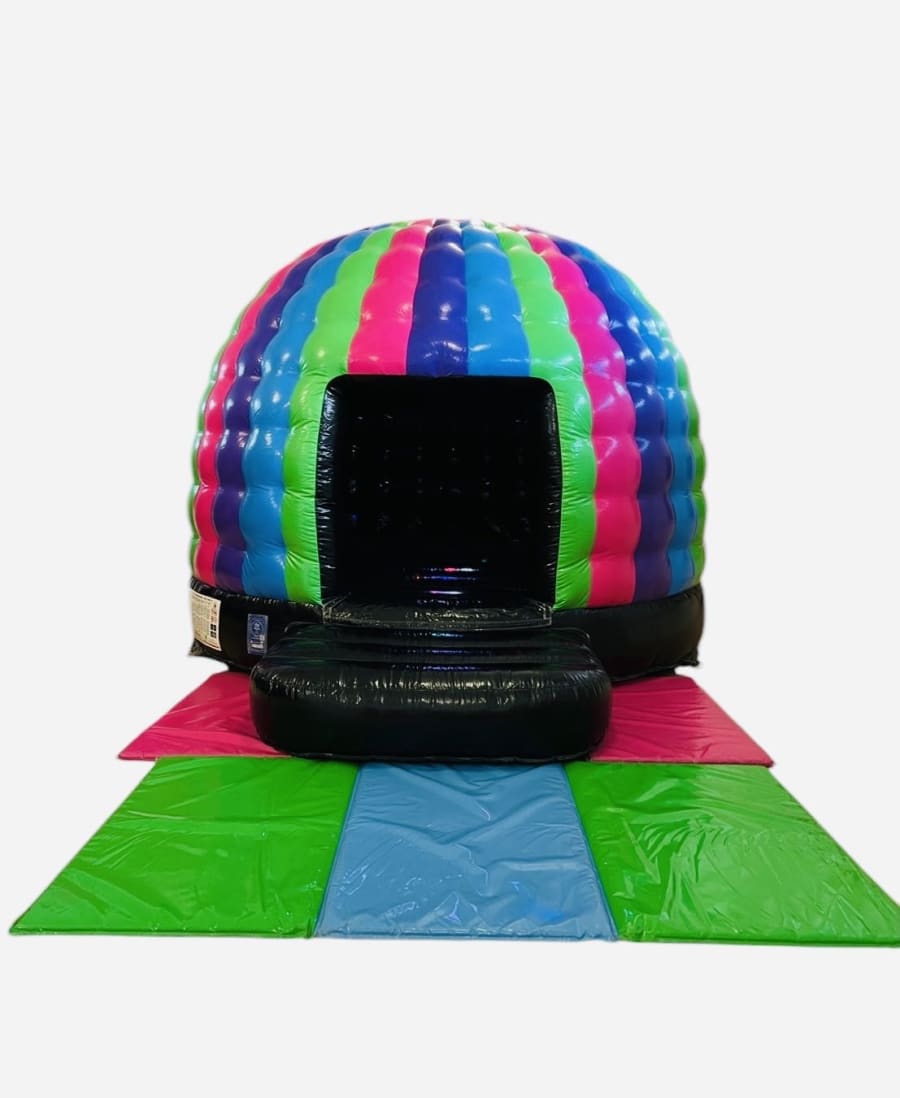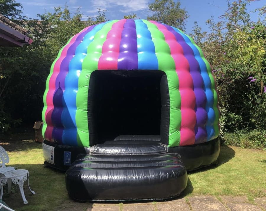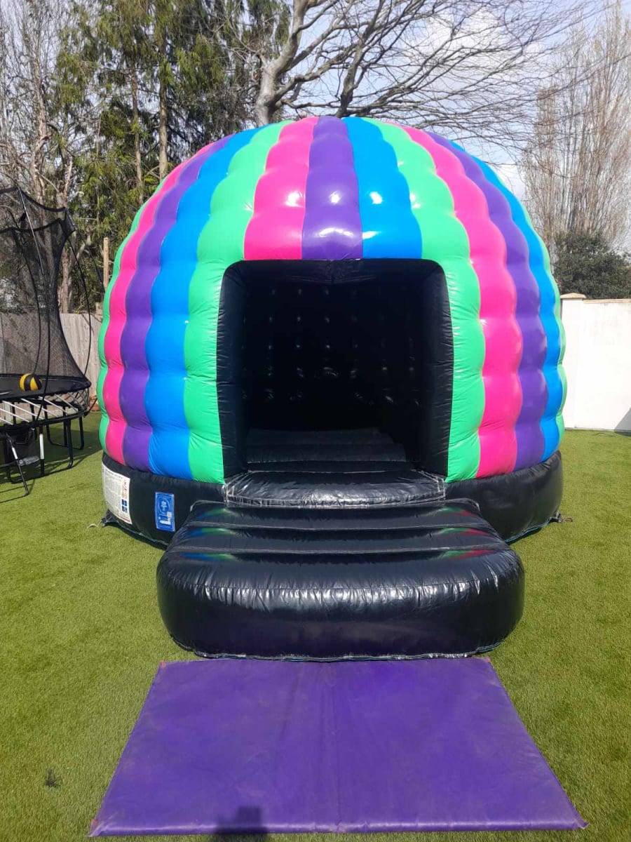 A disco dome is the best choice if you and your friends want to dance to your own music. This one in particular has pink, purple, blue and green bubble stripes compared to our rainbow ones! Inside you will find a bluetooth speaker and light system to entertain you! With this disco dome you can bounce and dance all evening! (Suitable for children only.)