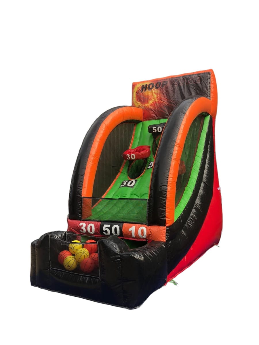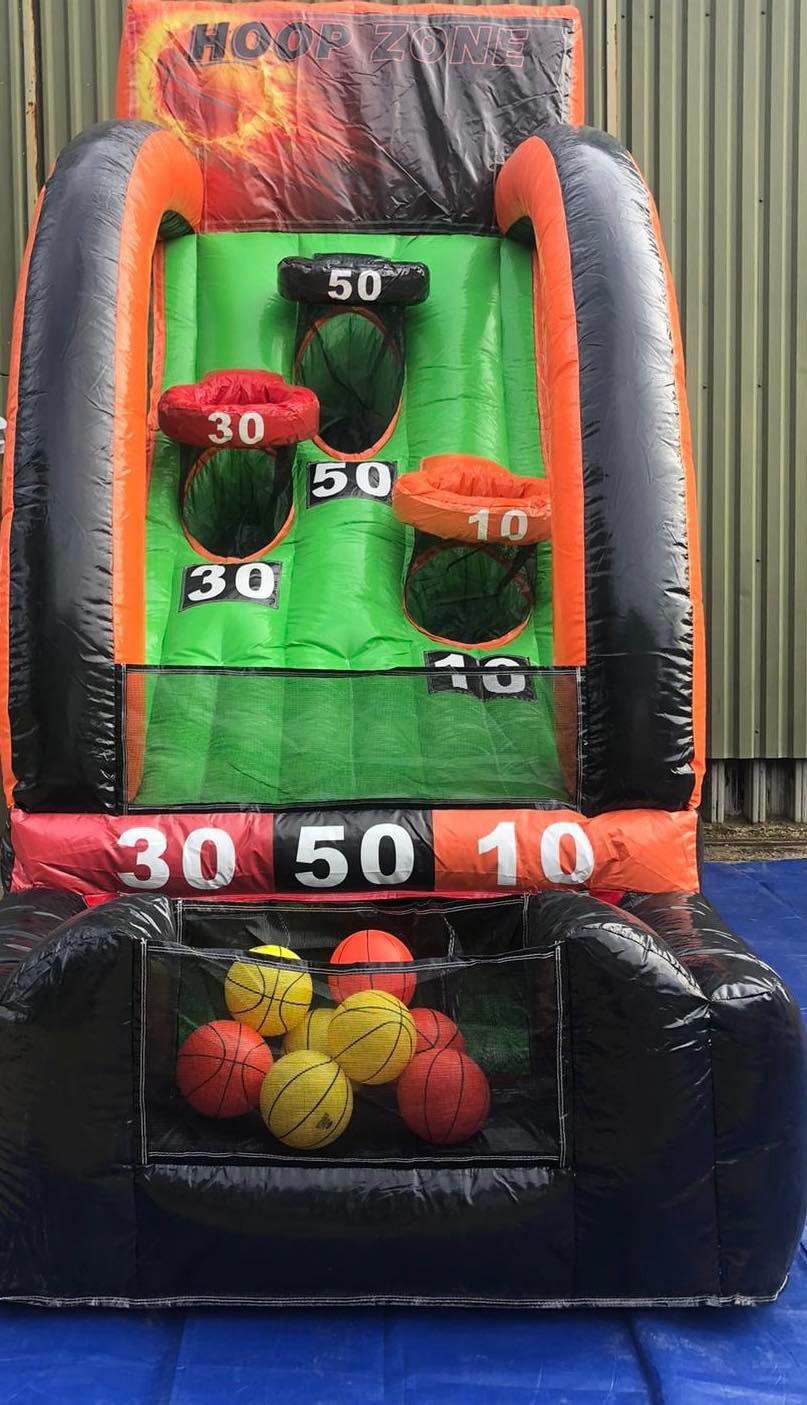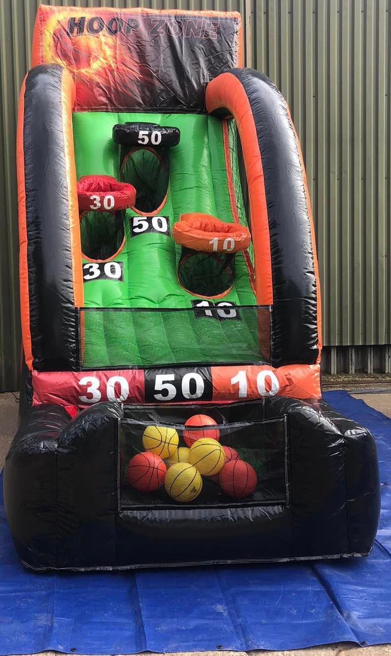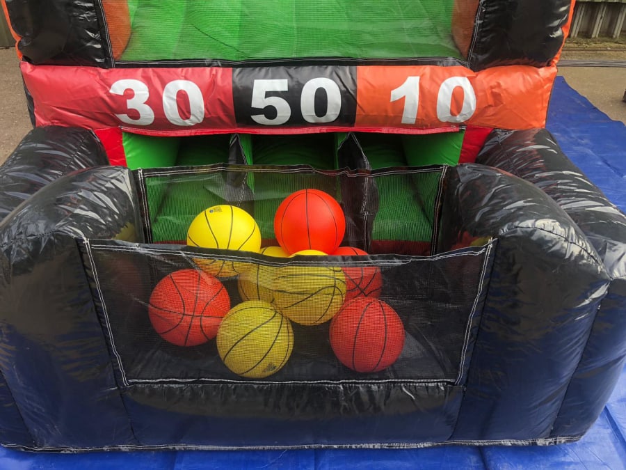 It is a great addition to any party, fun day or event. This Inflatable is brightly coloured and is approximately 15ft high. It has 3 baskets each with a different score 50, 30 and 10. This Inflatable Basketball Game comes with 3 basketballs.
