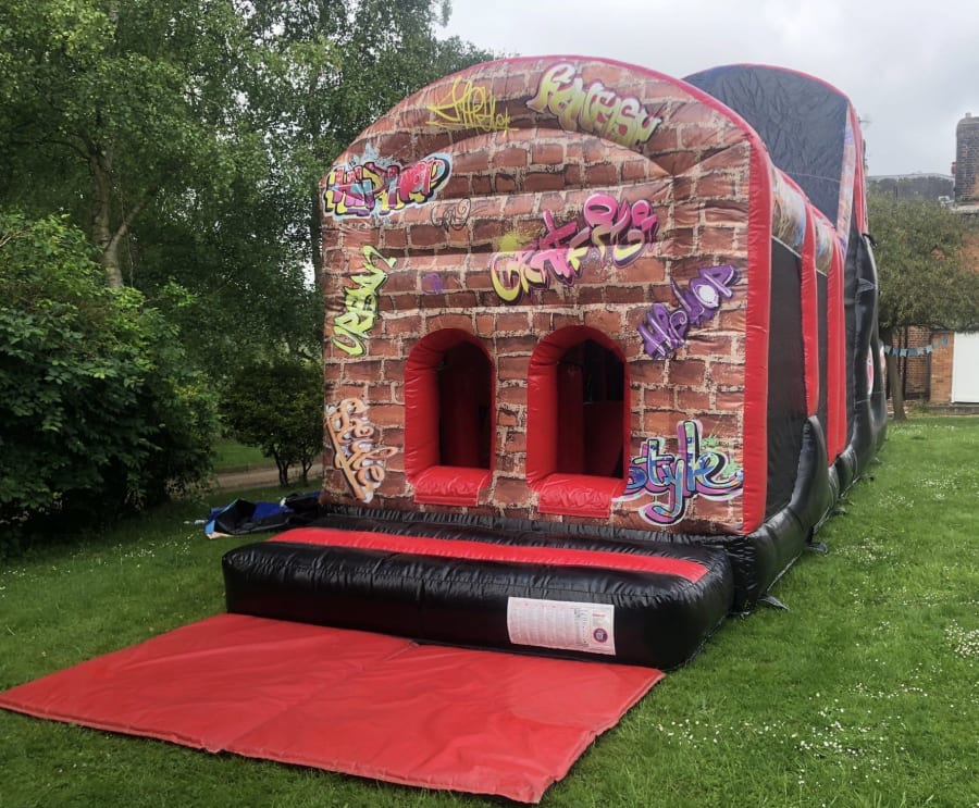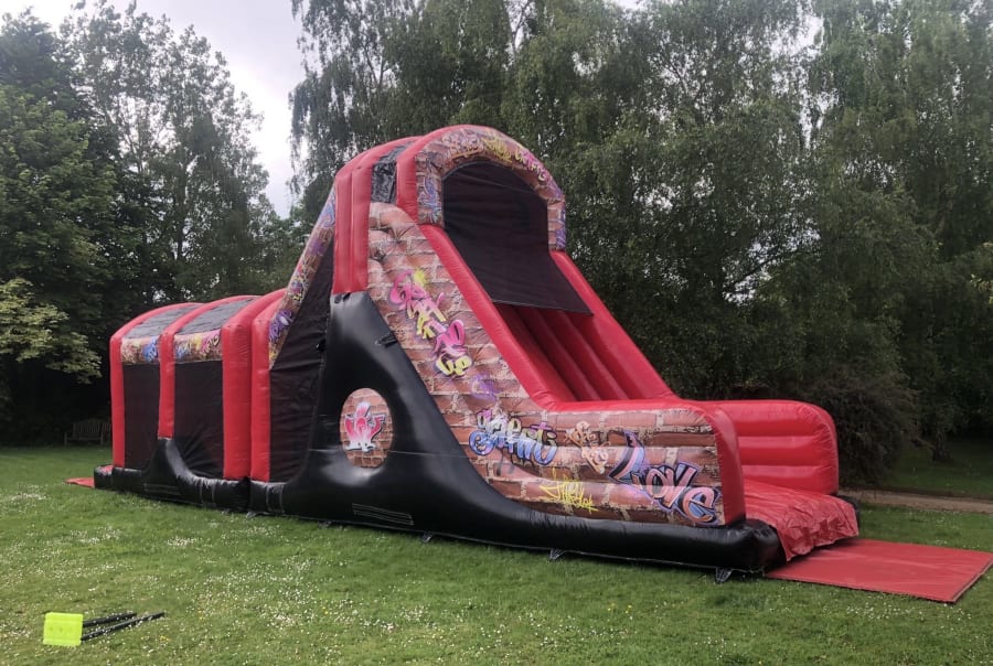 Our Graffiti 10ft Drop slide Fun Run is the perfect street art attraction for any occasion! With over 40ft of action in this super fun Obstacle Course its the perfect choice for any artsy party. Perfect for indoor or outdoor hire and available now!