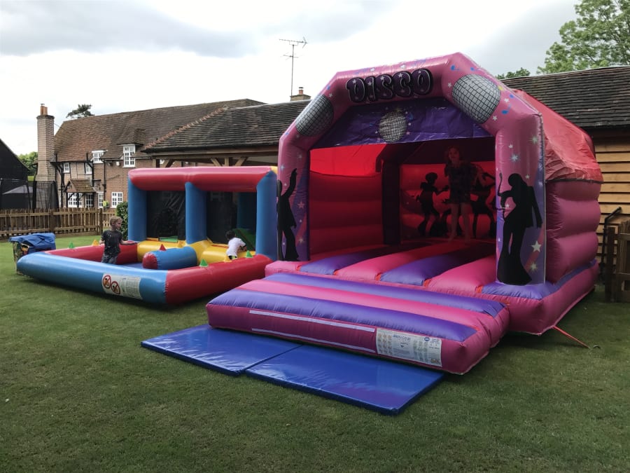 Fit with silhouettes of groovy dancers and reflective mirror balls this is the perfect castle for your disco themed festive event! This version is also available in blue with the same special affects listed. Our well known colours pink and purple make this a popular attraction.